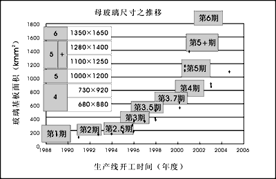 ??示圖1 母玻璃尺寸在2001年第5期時(shí)(1200mm*1200mm級(jí))、2002~2003年時(shí)第5+期(1100mm*1250mm級(jí))及6期(1250mm*1650mm級(jí))等尺寸的生產(chǎn)予預(yù)測(cè)速度。